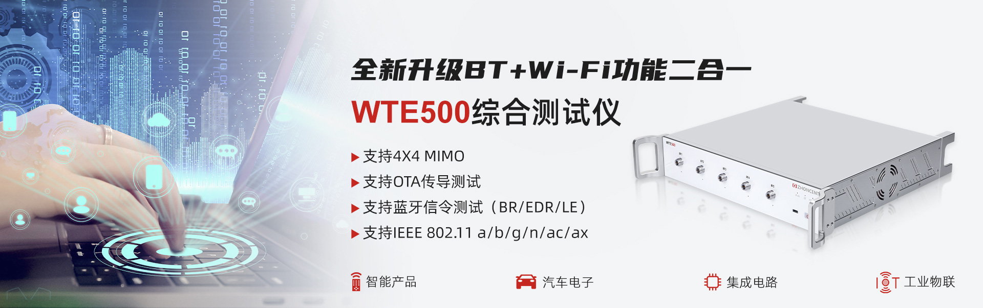 WTE800無線信令綜合測試儀(以下簡稱“WTE800”)是由深圳市中承科技有限公司自主研發和生產,可用于Wi-Fi設備在研發、生產、認證等環節測試的多功能綜合測試儀,通過配置客戶端或AP端參數,真實建立Wi-Fi網絡呼叫連接,自動實現被測件的各項射頻與協議性能指標精準測試。